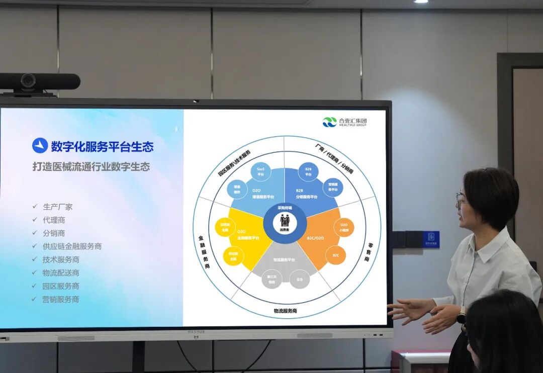 会议伊始,合壹汇集团副总裁李佩军向番禺区政数局领导一行重点汇报了数字化服务平台的建设成果。她表示,合壹汇集团已成功打造以SaaS独立站与供应链金融服务为核心的一站式数字化智能服务平台。该平台整合了集团丰富的产业资源——超8000家合作品牌厂家、逾10000家经销商及15万余个产品SKU,聚合了数字化营销、交易、交付及结算等全链路服务,构筑起坚实的产业数据底座。她重点阐述了数字化平台如何通过云分账系统重构传统资金路径,实现多方资金合规透明流转,有效破解医械流通的资金结算痛点。同时,AI标书自动解析、泰壹云SaaS系统及医械智库等工具的落地,也让企业投标与流通效率得到显著提升。