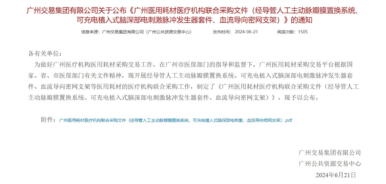 6月21日,广州交易集团有限公司发布7家三甲医院开展经导管人工主动脉瓣膜置换系统、可充电植入式脑深部电刺激脉冲发生器套件、血流导向密网支架等医用耗材的医疗机构联合采购工作的通知。